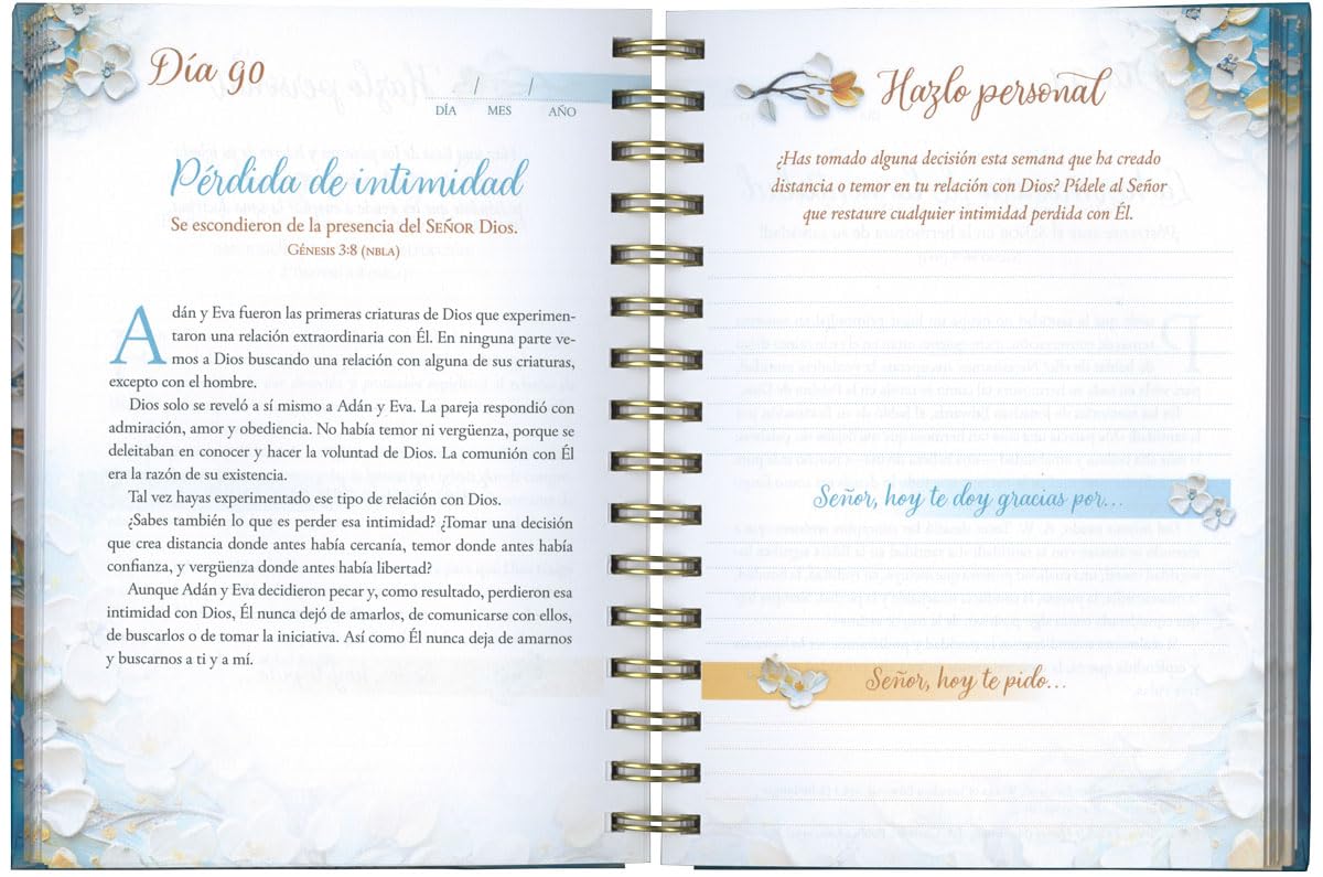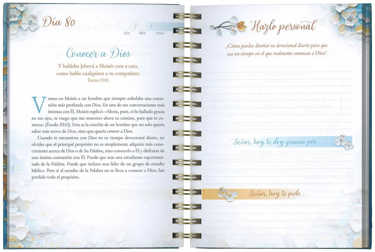 • Reflexiones devocionales diarias y extensas en formato de diario, en tapa dura con espiral.