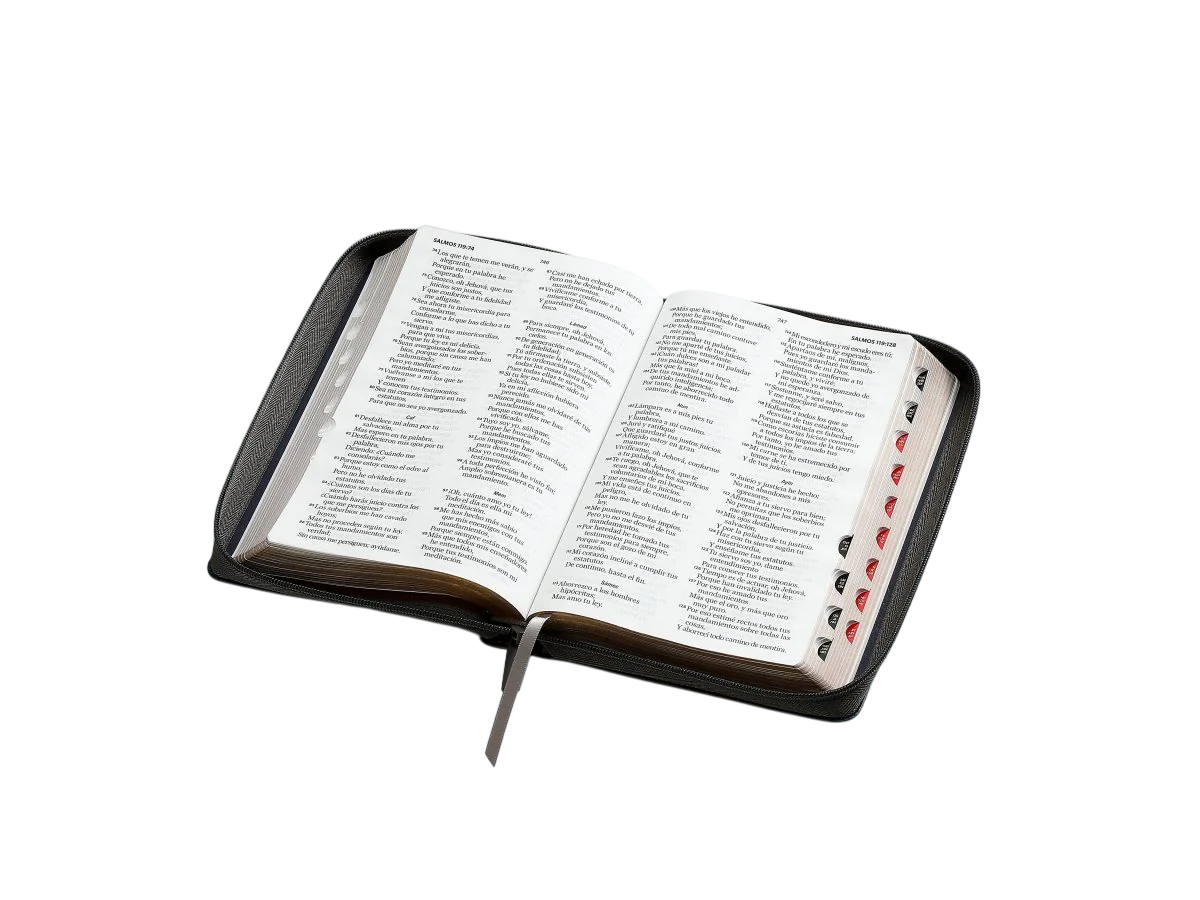 Reina Valera 1960, tamaño manual (138x212 mm), imitación piel tritono, canto dorado, con cierre y con índice, palabras de Jesús en rojo, concordancia , Concordancia de personajes bíblicos. ayudas, referencias cruzadas. 32 páginas a todo color con ayudas y esquemas. 12 mapas a todo color. Letra 12.5 puntos.