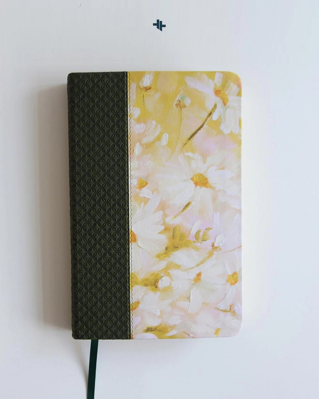 Biblia tamaño manual, ultrafina y con letra grande. Símil piel verde con flores blancos, cinta marcadora, y estudio conciso de los nombres de Dios.