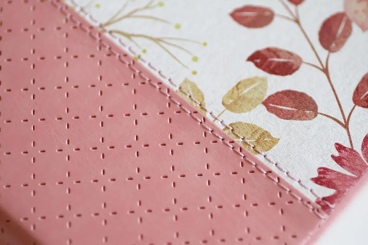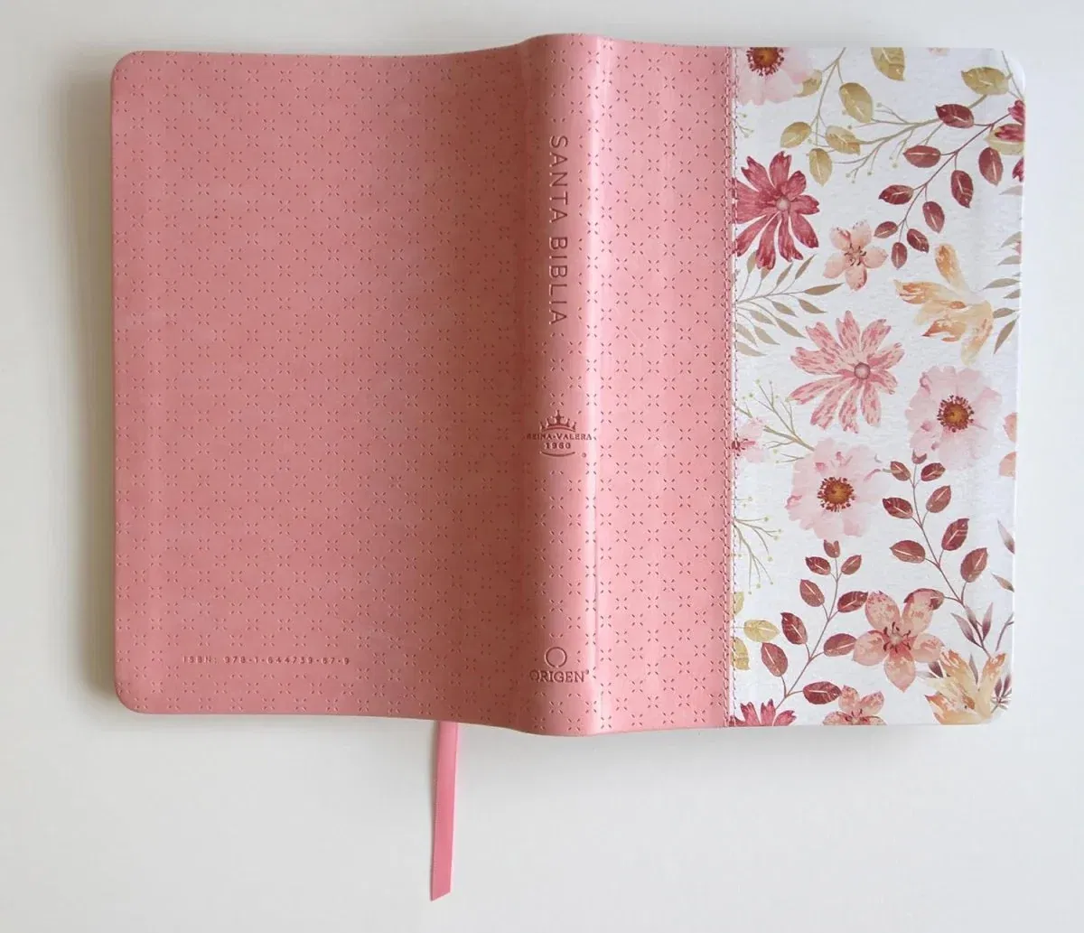 Biblia tamaño manual, ultrafina y con letra grande. Símil piel rosada con flores rosadas, cinta marcadora, y estudio conciso de los nombres de Dios