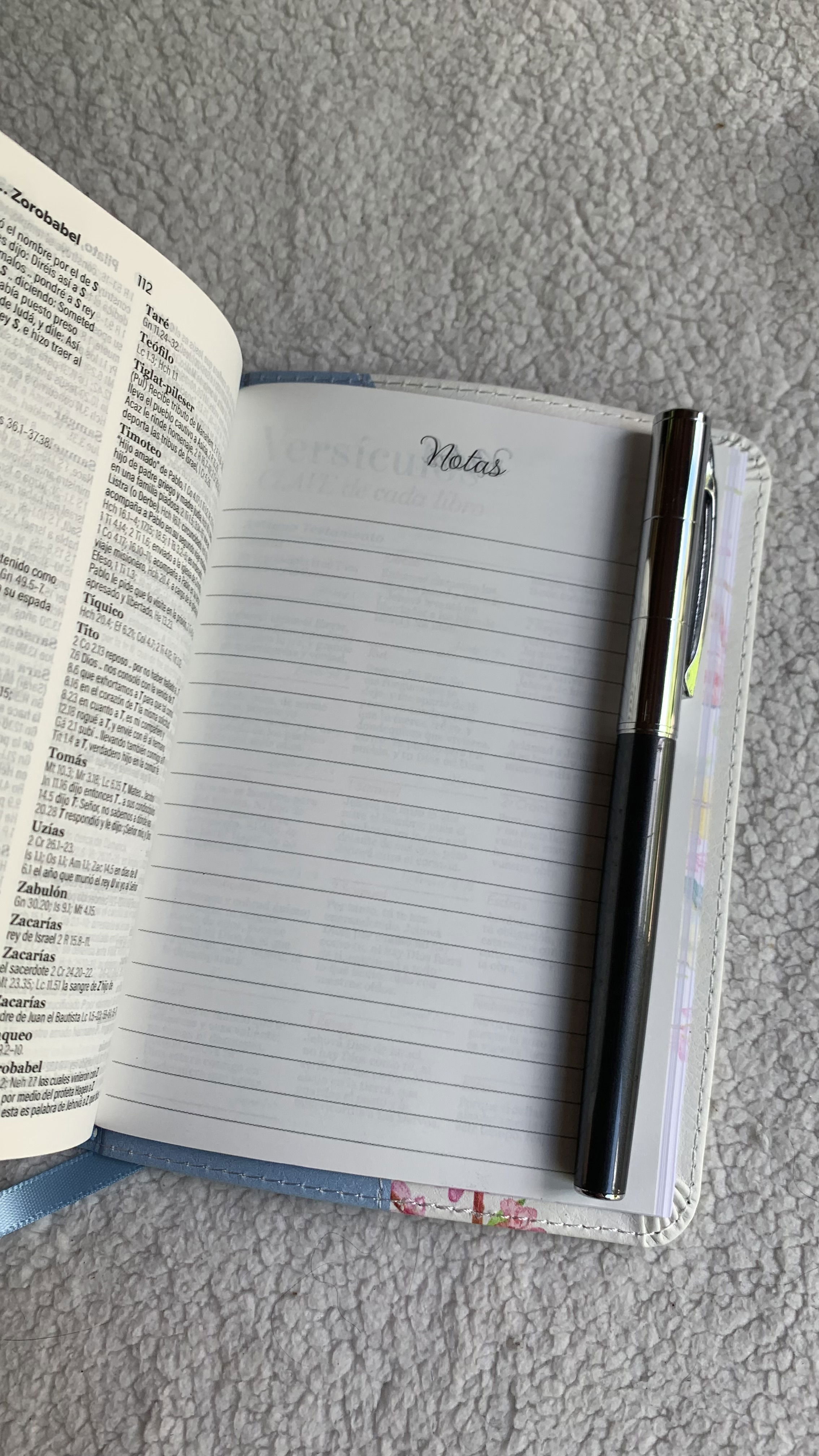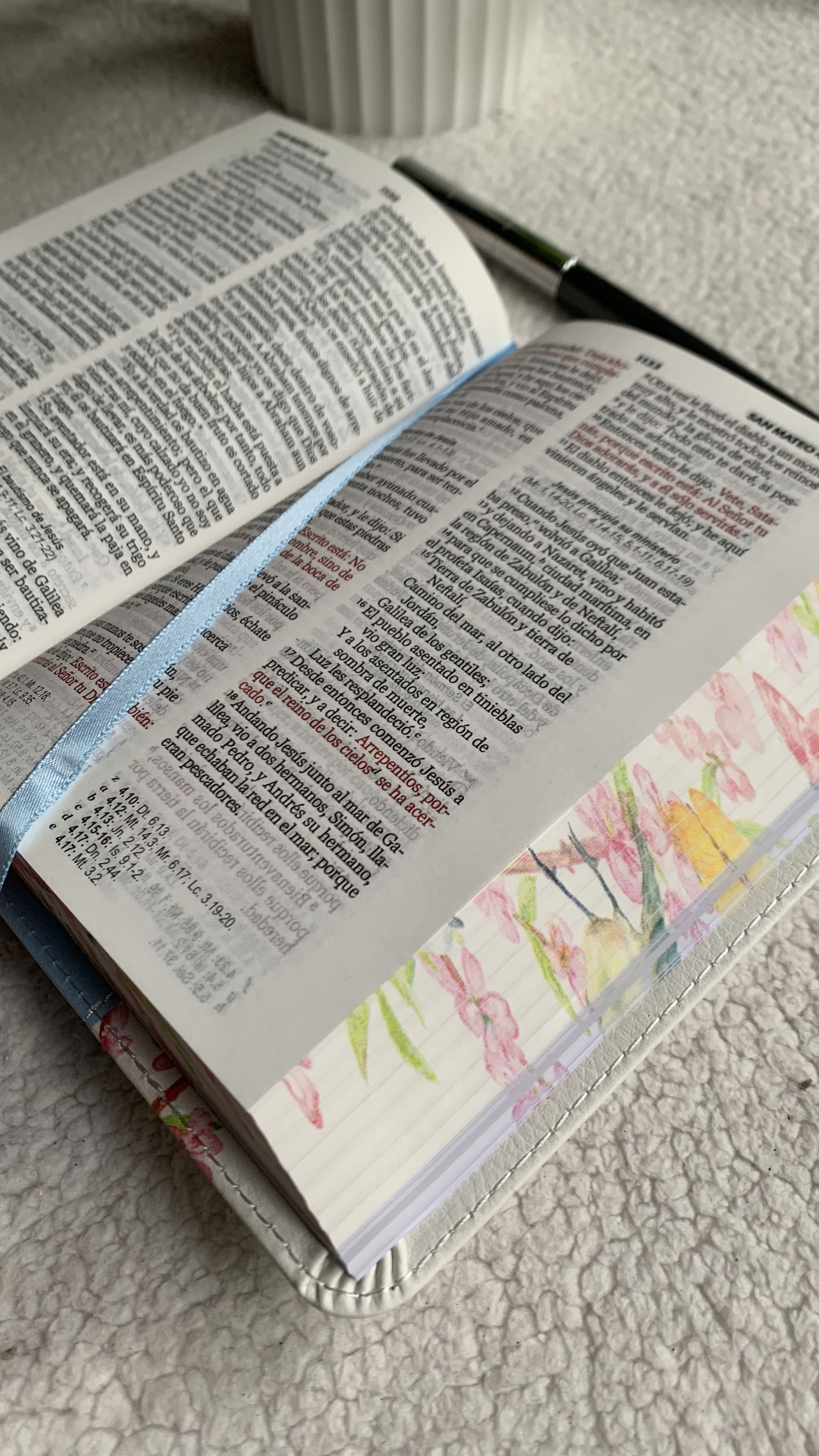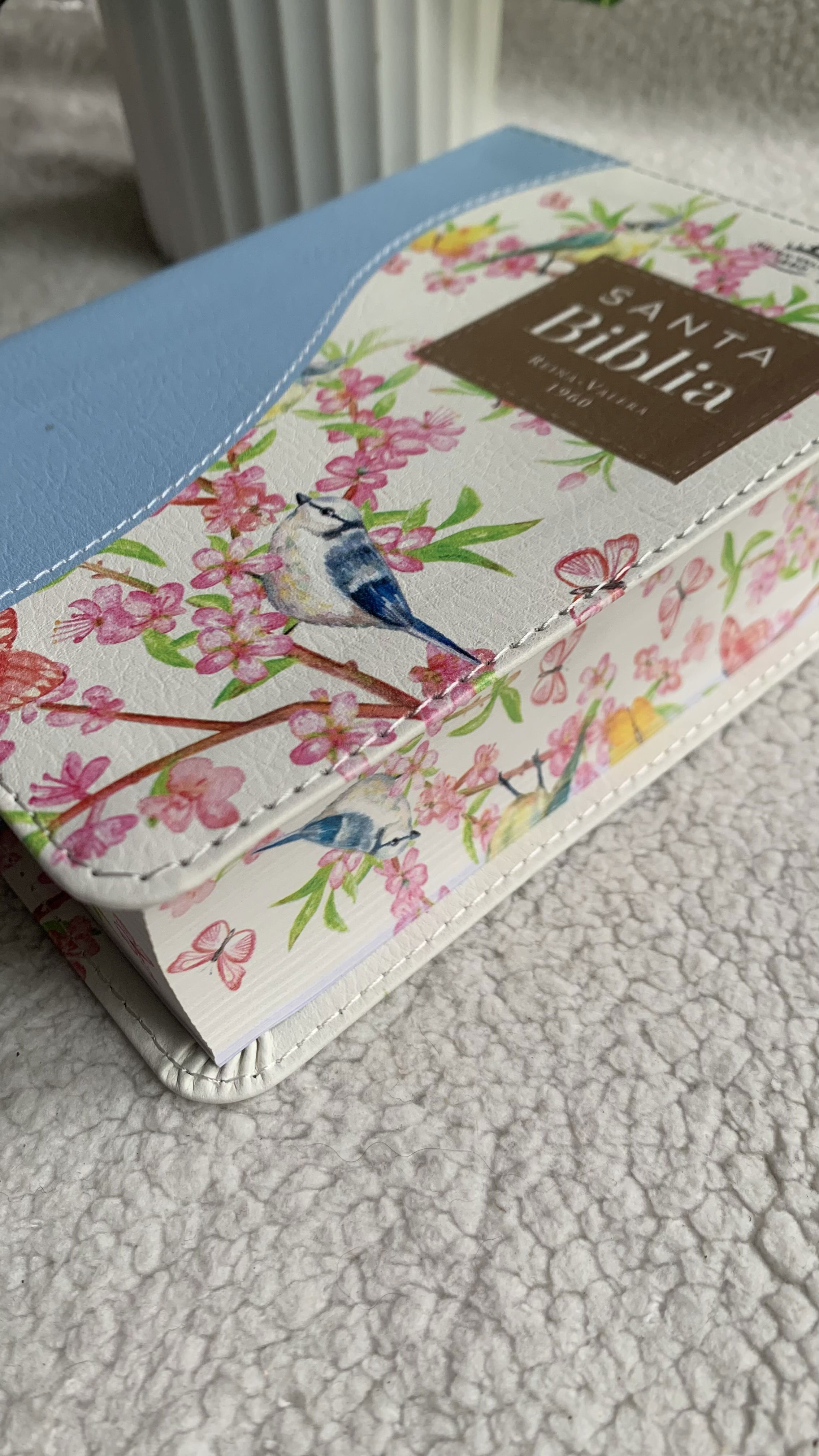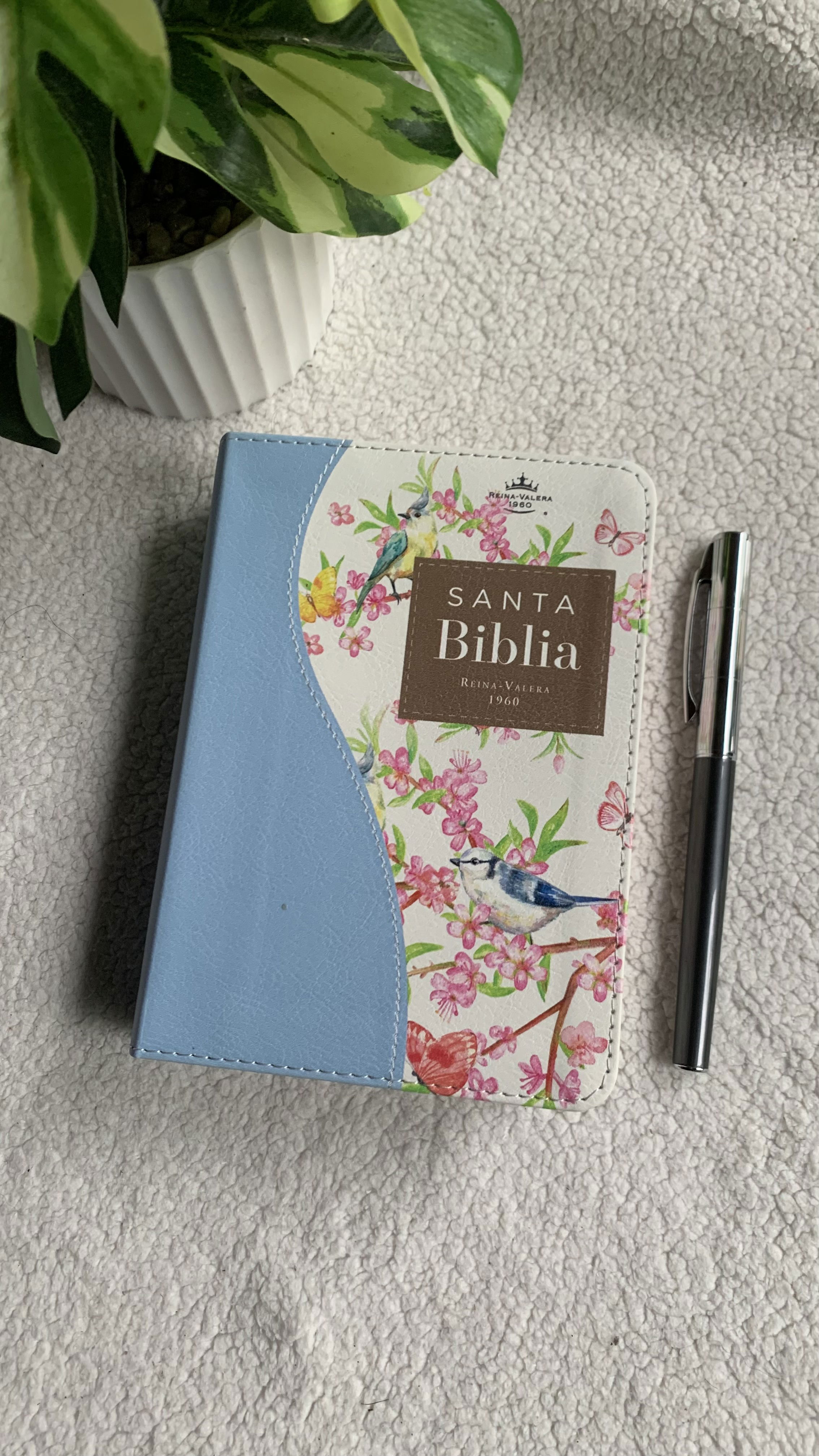 Reina Valera 1960, tamaño bolsillo, Imitación piel con canto pintado con motivo flores, palabras de Jesús en rojo. Concordancia amplia de palabras de la Biblia, concordancia personajes. 32 páginas a todo color con ayudas y esquemas. 12 mapas a todo color. Referencias cruzadas.
